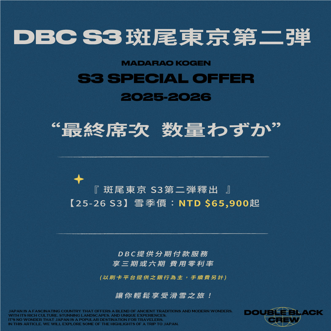 B: 滑雪年齡限制: 目前DOUBLE BLACK CREW對於滑雪初學教學年齡限制為5~60歲,若團員要帶未滿5歲的小朋友或60歲以上的長輩參加,我們可接受參團但不含滑雪教學之責。若有疑問請向客服專員洽詢。